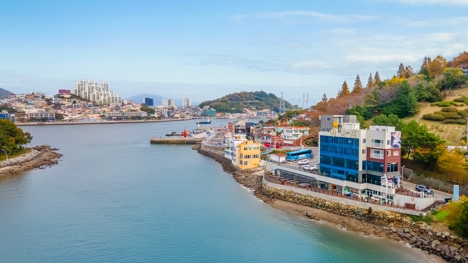 해상케이블카 탑승장인 돌산공원과 유람선 선착장,